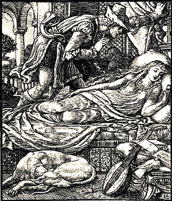 And, in the very moment when she felt the prick, she fell down upon the bed that stood there, and lay in a deep sleep. And this sleep extended over the whole palace, the king and queen who had just come home, and had entered the great hall, began to go to sleep, and the whole of the court with them. The horses, too, went to sleep in the stable, the dogs in the yard, the pigeons upon the roof, the flies on the wall, even the fire that was flaming on the hearth became quiet and slept, the roast meat left off frizzling, and the cook, who was just going to pull the hair of the scullery boy, because he had forgotten something, let him go, and went to sleep. And the wind fell, and on the trees before the castle not a leaf moved again.